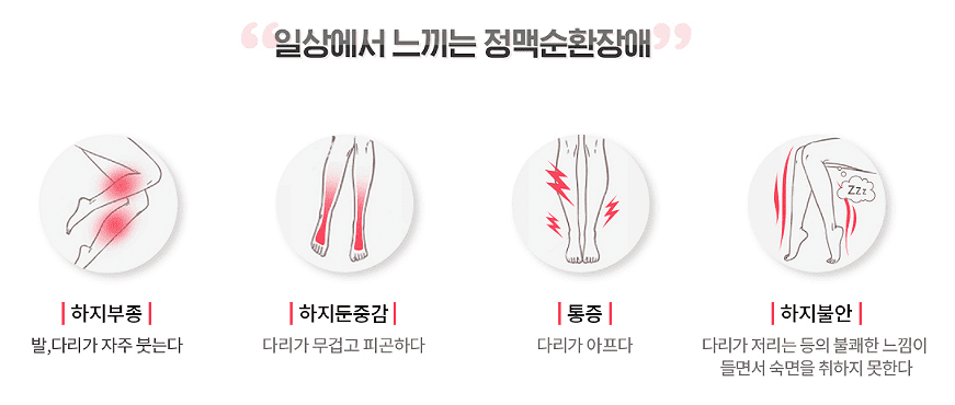 발이나 다리가 자주 붓거나, 다리가 무겁고 피곤하거나, 통증이 생기거나, 저리고 쥐가 자주 나고, 다리가 가렵고 차며, 다리가 불안해지는 증상들입니다.