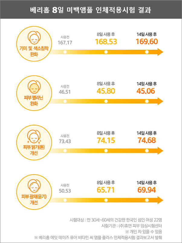 이 시험은 만 30세~60세의 한국의 건강한 성인 여성 22명을 대상으로 휴먼 피부 임상시험센터에서 한 것으로 이 자료는 베리홈 에잇 데이즈 퓨어 피타 민 C 앰플 플러스 인체적용시험 결과보고서에서 발췌한 것입니다.