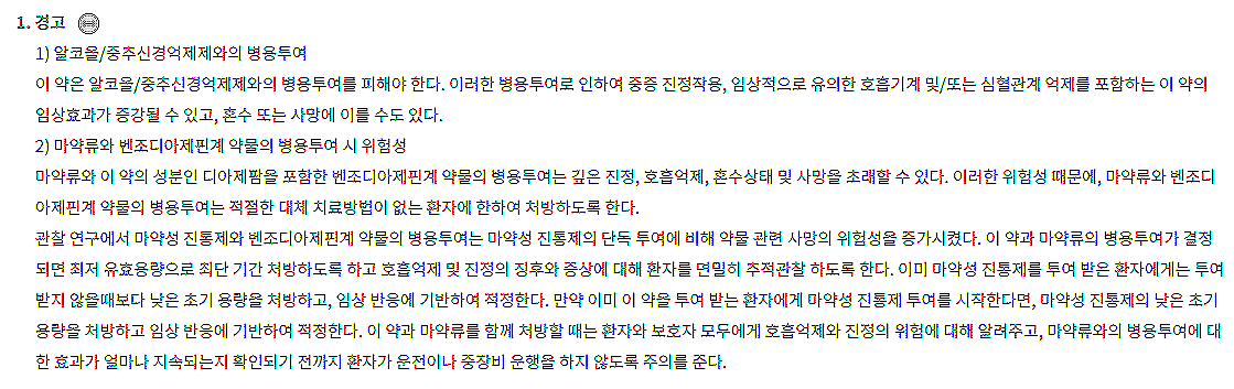 - 알코올, 수면제, 진통제, 항정신병약, 항우울 약, 리튬에 의한 급성 중독 환자 등에겐 신중하게 투여해야 합니다.