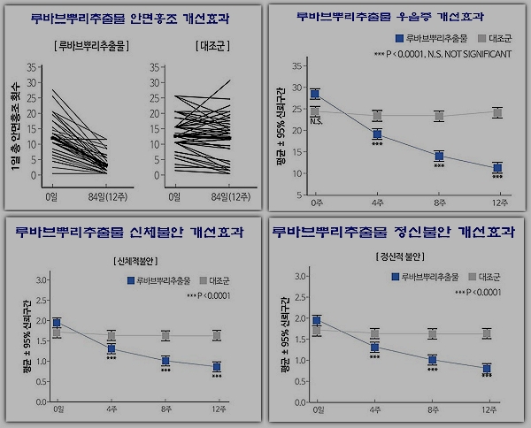 실제로 루바브뿌리추출물을 45세~55세의 갱년기 여성 109명에게 매일 4mg씩의 루바브뿌리추출물을 12주 동안 섭취하게 한 결과, 안면홍조, 가슴두근거림, 불면증, 우울증, 신경질, 피로감, 신체적 정신적 불안 등 여성갱년기를 나타내는 11가지 지표가 모두 유의미하게 개선되었음을 확인했다고 합니다.(아래 그래프 참고)