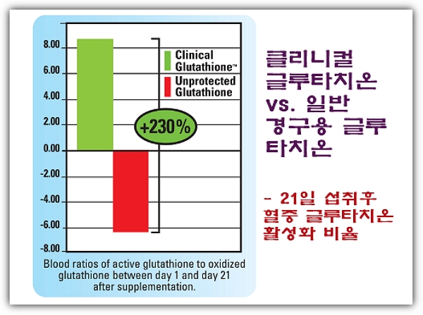 클리니컬 글루타치온이 섭취 후 1일과 21일 사이에 혈중 산화된 글루타티온에 대한 활성 글루타티온의 비율이 일반 경구용 글루타치온에 비해 230% 더 높았다는 결론이 나왔다고 합니다.(아래 그림 참조)